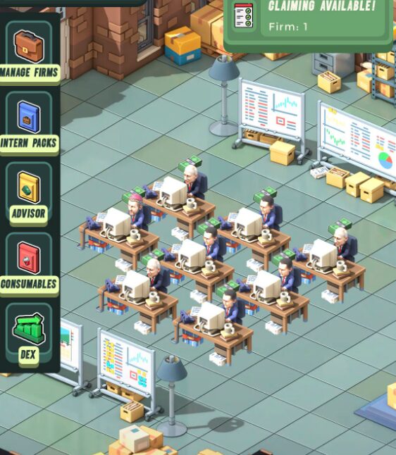 あなたはCEO(社長)になって、自分の「Firm(会社)」を運営。インターンを雇ってデスクに配置し、会社の「効率」を上げて、ゲーム全体のトークン$CASHをみんなで分け合うシェアを競います。